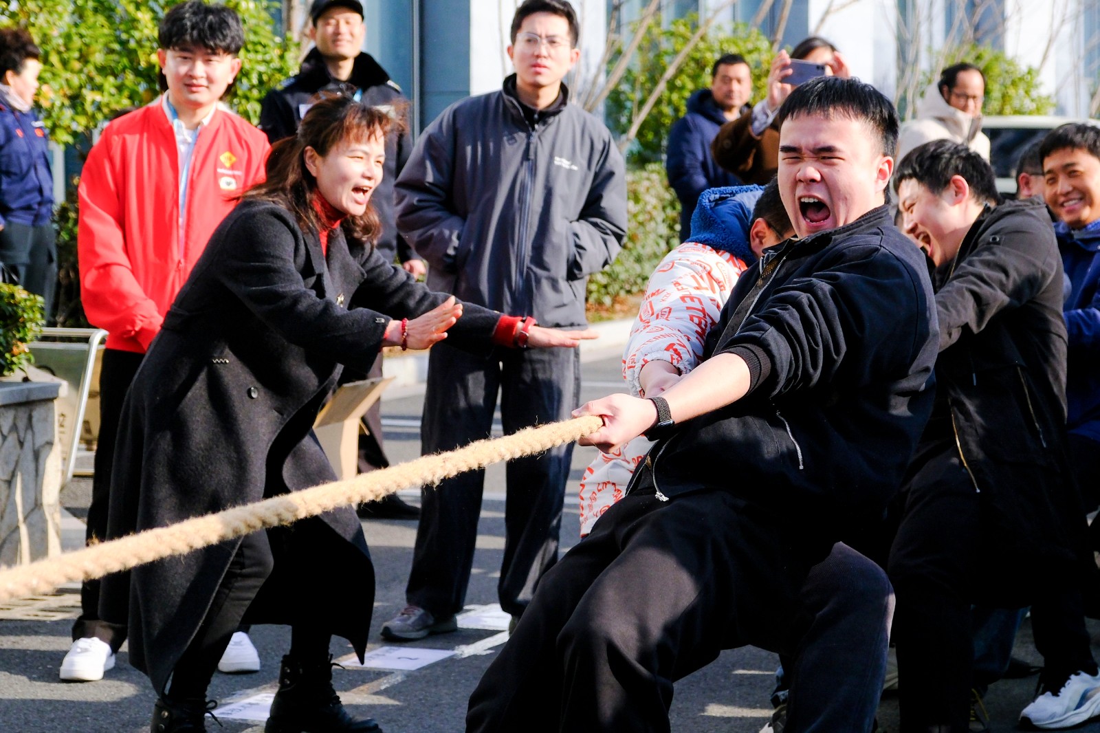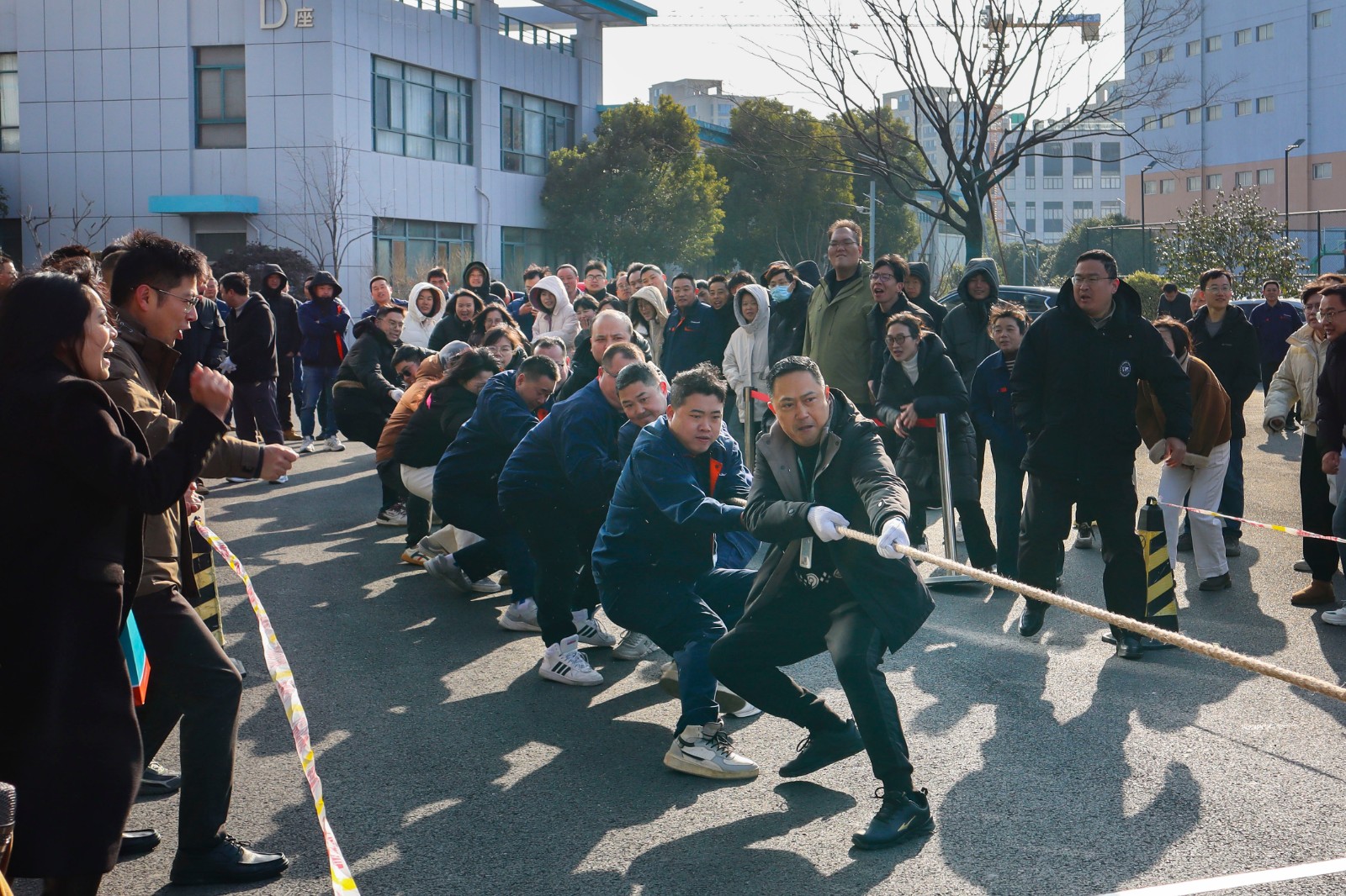 隨著裁判員的一聲清脆哨響,兩大園區(qū)的拔河比賽正式打響。參賽隊(duì)員們起繩、拉緊、挺身、開(kāi)拔,瞬間的爆發(fā)力沖向云霄,各個(gè)憋的面紅耳赤,使出了渾身力氣,大家一起“一二一二”的喊著口號(hào),卯足勁往一處使,將力量擰成一股繩,團(tuán)結(jié)一致、頑強(qiáng)拼搏。場(chǎng)邊啦啦隊(duì)們也不甘示弱,吶喊聲、助威聲一波一波沖擊著賽場(chǎng),氣氛熱烈愉悅。