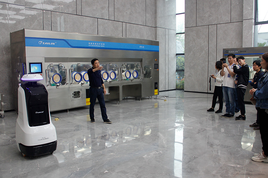 泰林生物副總經(jīng)理夏信群向各位領(lǐng)導(dǎo)、專家們介紹正在自動(dòng)行走的滅菌機(jī)器人,以及應(yīng)用于CAR-T細(xì)胞治療的細(xì)胞治療工作站。