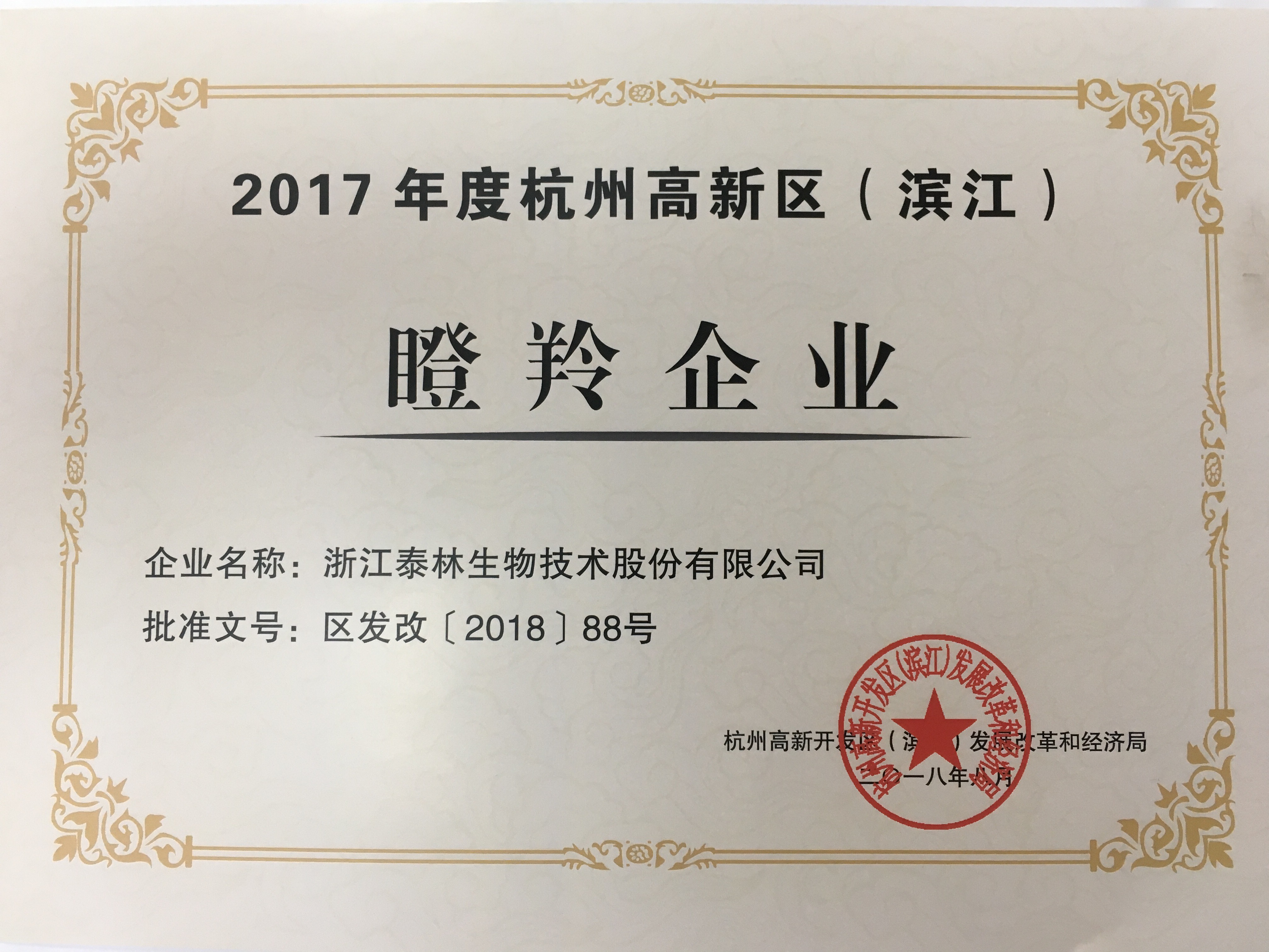 2018年8月下旬,2017年度高新區(qū)(濱江)瞪羚企業(yè)名單公布,浙江泰林生物技術(shù)股份有限公司榜上有名,標(biāo)志著泰林生物連續(xù)3年獲評(píng)高新區(qū)(濱江)瞪羚企業(yè)稱號(hào)。